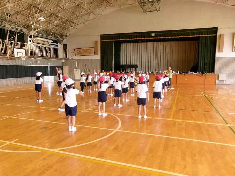 最初に、体育館で年長さんたちをお迎えしてあいさつをし、歌とダンスで歓迎しました。