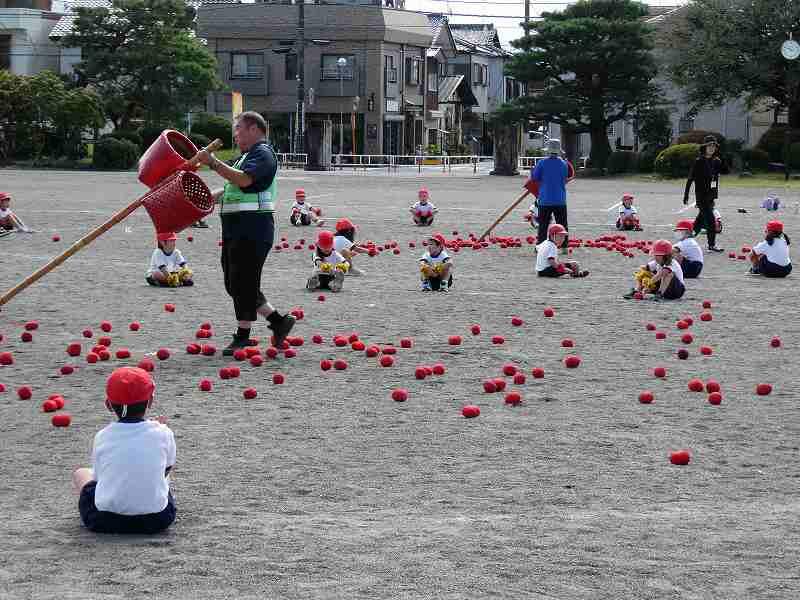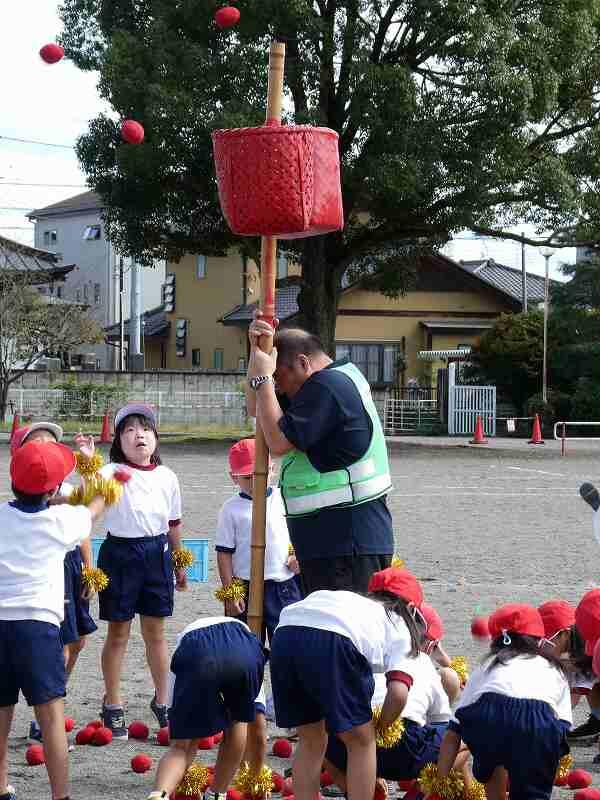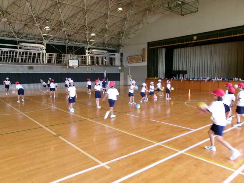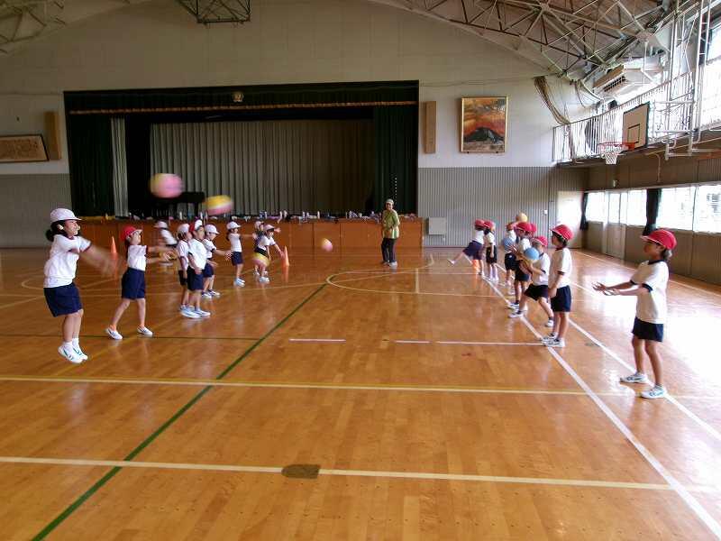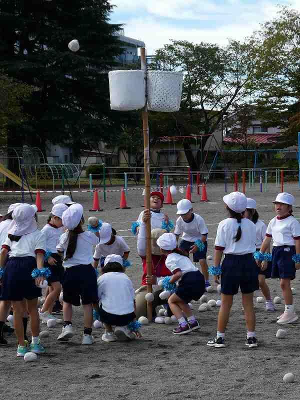 曲にあわせて元気にダンスを踊った後、かごをめがけてまりを投げ入れます。こどもたちは、楽しそうに練習をすることができ、後片付けもしっかりできました。