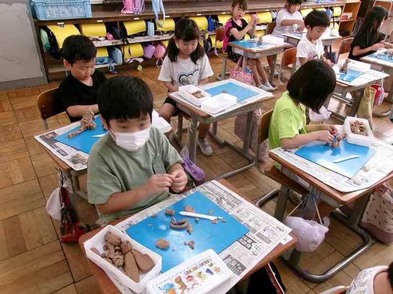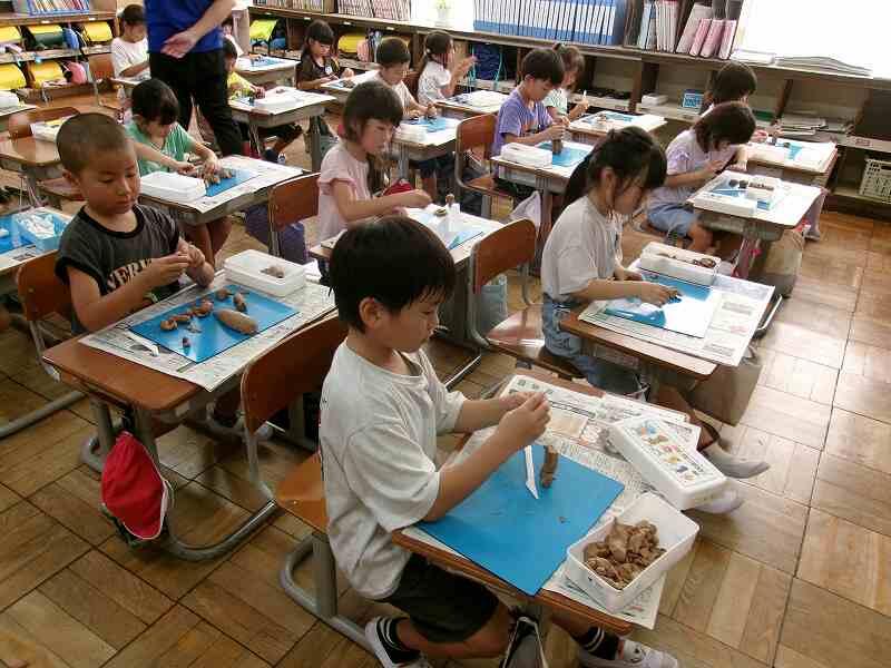 図工の授業の様子です。「いっしょにおさんぽ」の学習で一緒に散歩をしたい生き物を想像して作りました。子どもたちは、想像力を駆使しながら作品を楽しんでつくることができました。