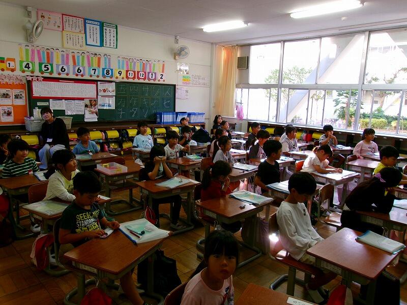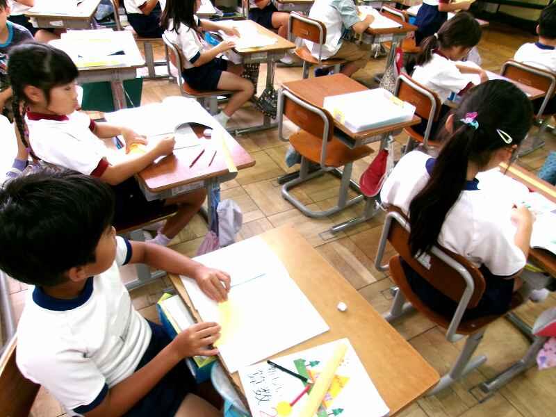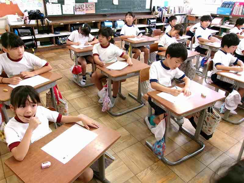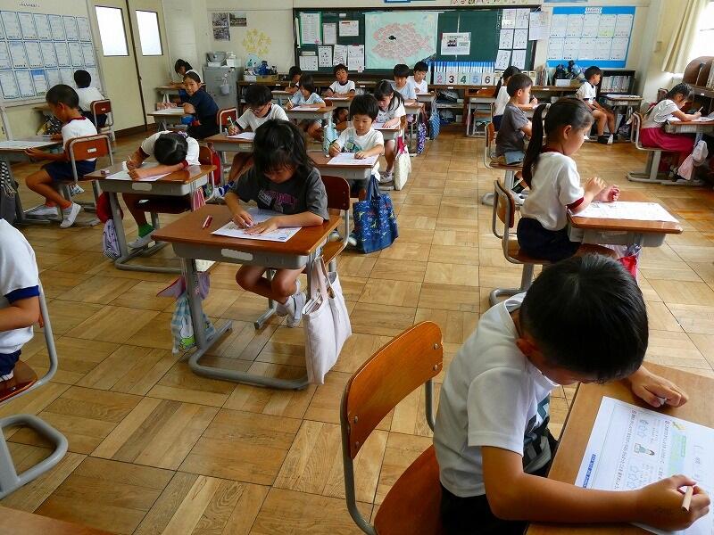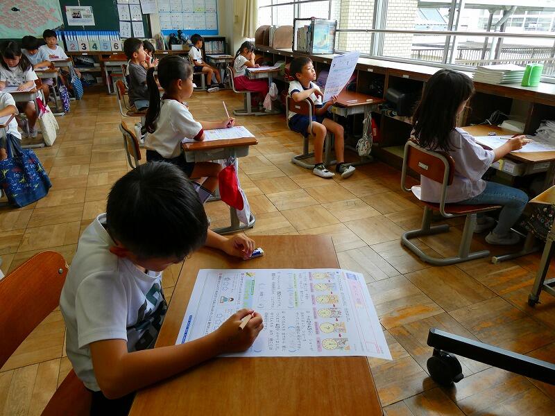 算数の授業です。単元のまとめテストをしています。「時こくと時間」は子どもたちにとって複雑な内容ですが、2年生の子どもたちは、学習した内容を思い出しながら真剣に取り組んでいました。