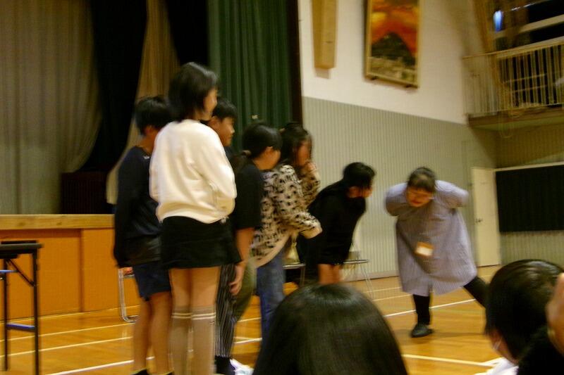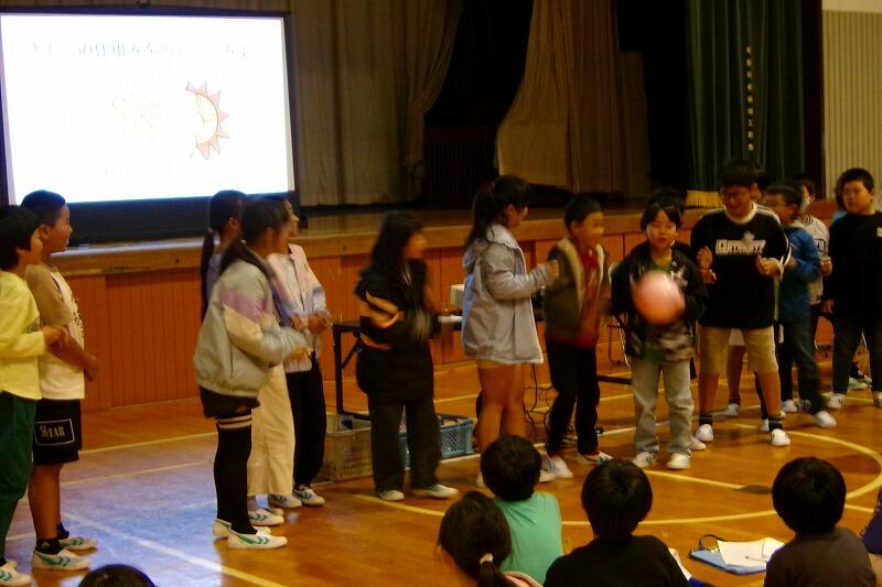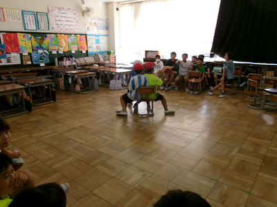 次に、「もうじゅうがりにいこうよ」で、グループ作りをしました。子どもたちは、ウェイクの人の言葉をよく聞いて、他のクラスや、時には他の学校の子とグループを作ることができました。