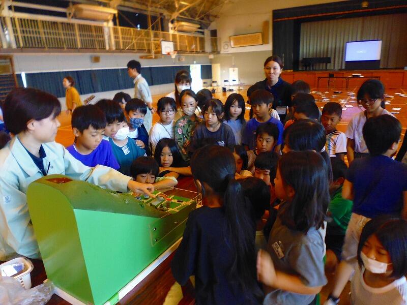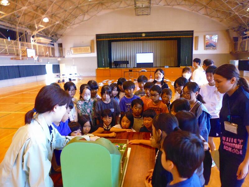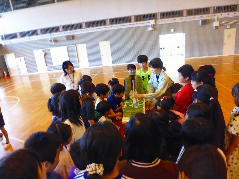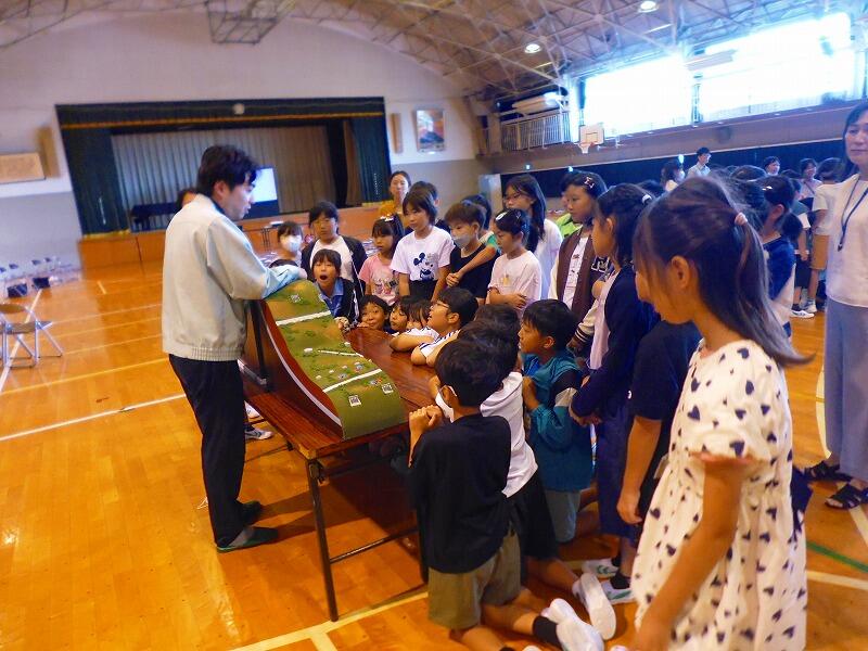 子どもたちは、最初に、森林の働きや土砂災害について、スライド・映像資料で学んだ後、土砂災害の起きる仕組みについて、模型を使って教えていただきました。