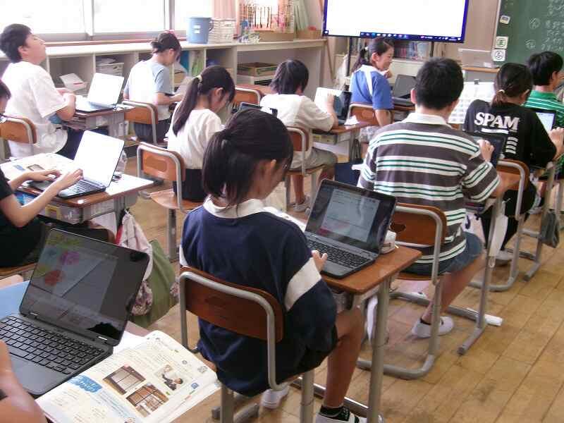 国語の「未来につなぐ工芸品」の授業です。日本の伝統的な工芸品についての説明文を読んで、内容を要約したり、工芸品について調べたりする学習です。