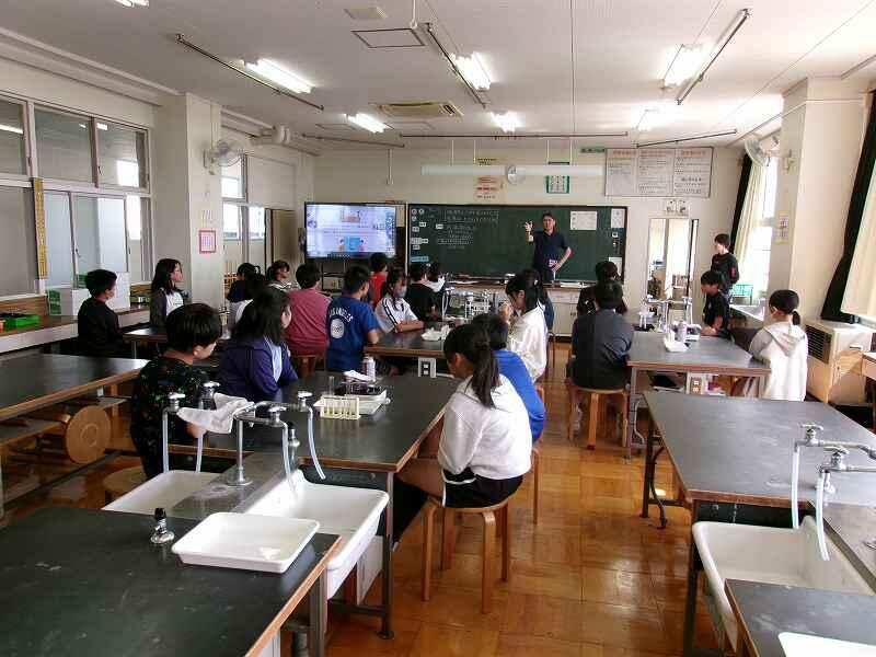 理科の授業の様子です。「水溶液の性質」の学習で、塩酸の中に溶けた金属を取り出す実験をしました。それぞれのグループで仮説を立て、実験をすることで、学習に対しての理解を深めることができました。