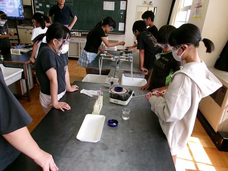 子どもたちは、実験用ガスコンロや水溶液を安全に正しく使って実験を行っていました。