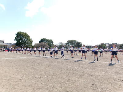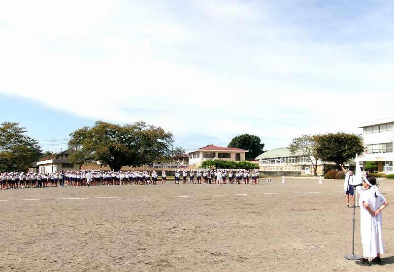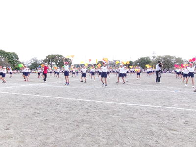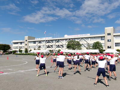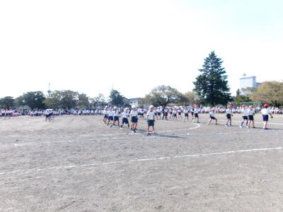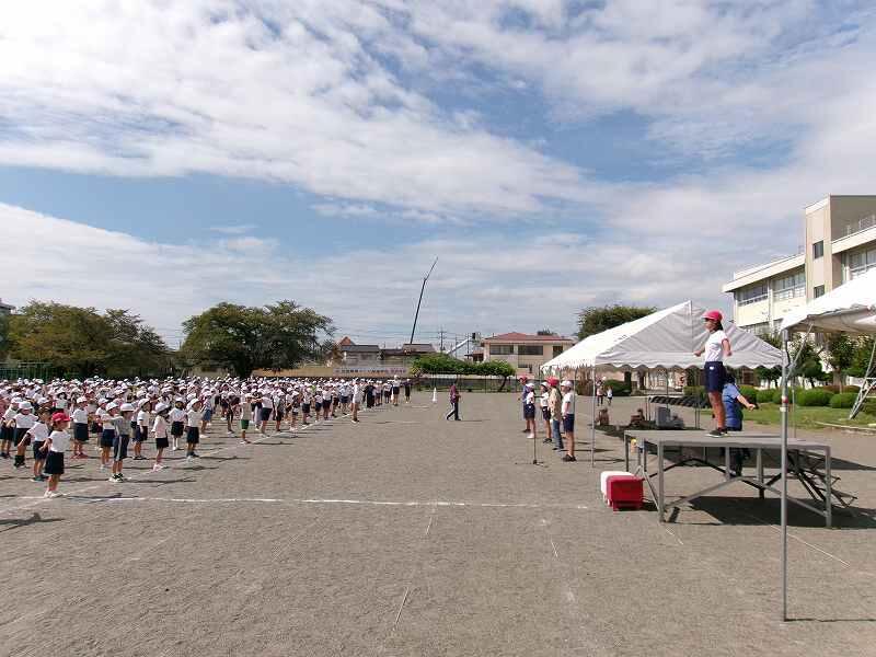 今日の2校時に、全校生が校庭に集合し、運動会の全体練習を行いました。