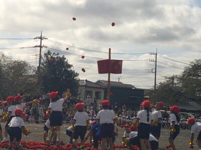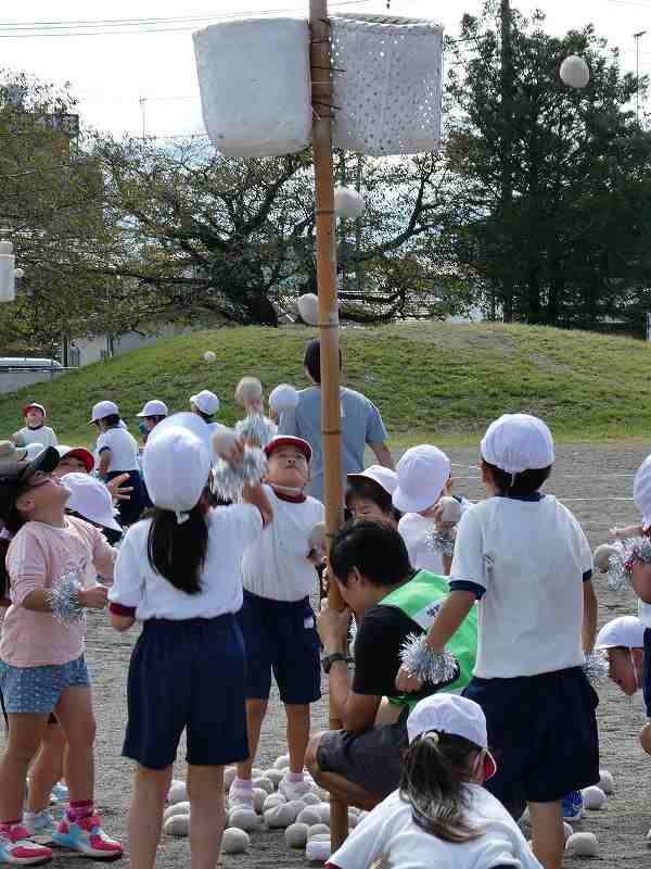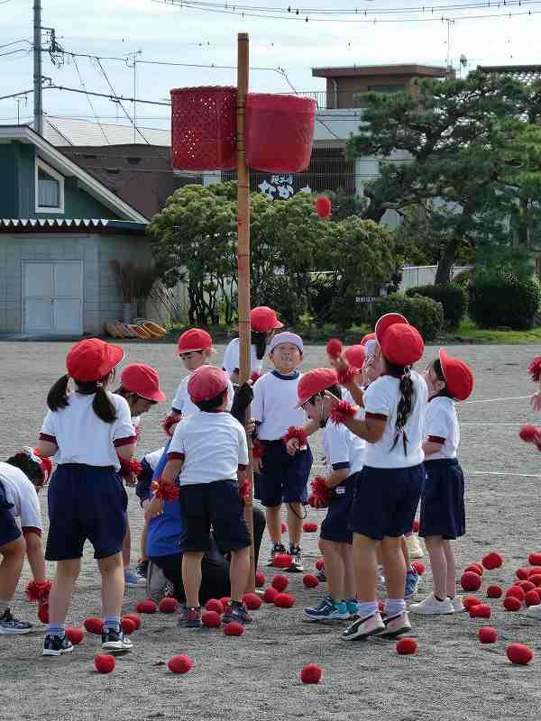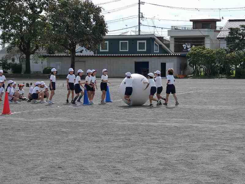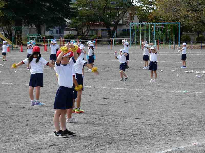 1年生は、初めての運動会に向けて練習を頑張っています。今日は、「ダンシング!! ダンシング!! まり入れ」の練習を行いました。