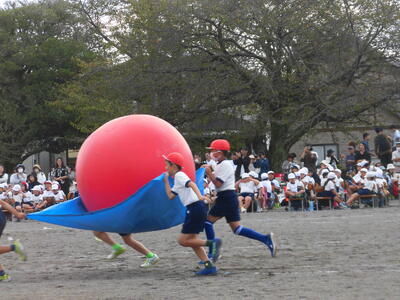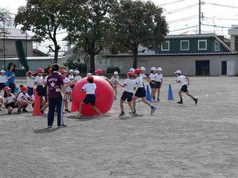 運動会の練習の様子です。4年生の団体種目「大玉運び界隈」の練習をしています。互いに協力して大玉を運んだり受け渡したりしました。