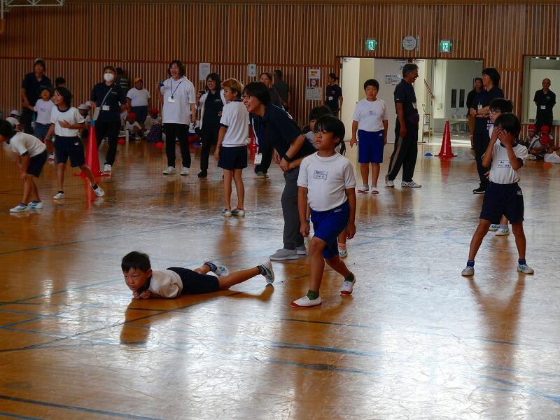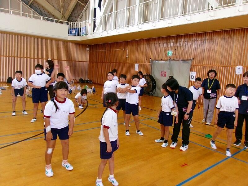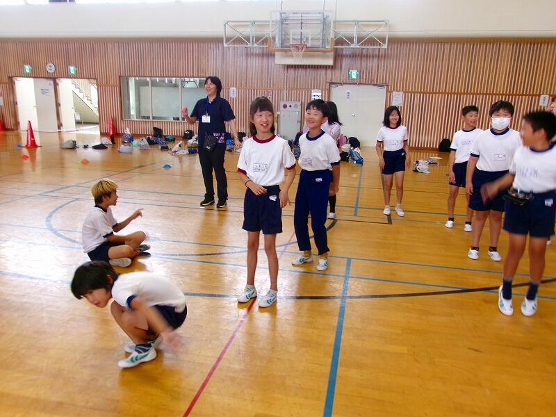 体育の授業です。準備体操としてじゃんけんを使ったゲームをしています。子どもたちは、できるだけ大きくジャンプできるように工夫したり、リズムよく跳ぶことができるように楽しみながら運動していました。