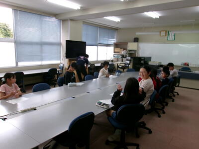 MIMの様子です。2年生では、クラスを2つに分けてMIMの授業を行っています。少人数で行うことにより、よりきめ細かに言葉の指導ができるようにしています。