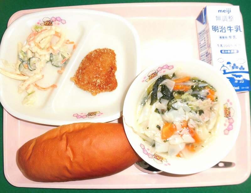ワンタンは中国生まれの料理です。漢字では「雲を呑む」と書いて「ワンタン」と読みます。名前の由来はいろいろな説がありますが、スープに入れたワンタンの様子が空に浮かんだ雲のように見えたことからこの名前になったと言われています。給食のワンタンには具を包んでいませんが、つるんとした皮の食感が食欲をそそり、野菜も肉もおいしく食べることができます。
