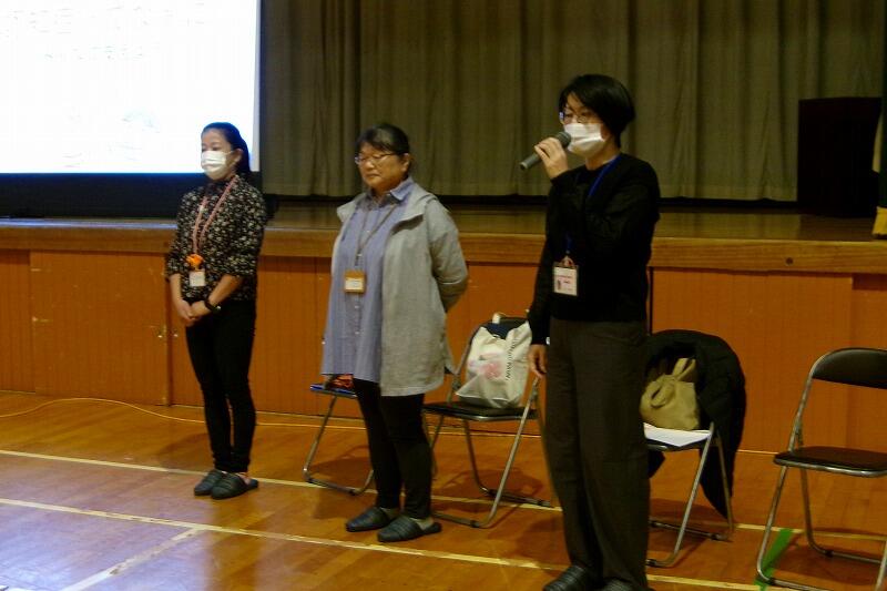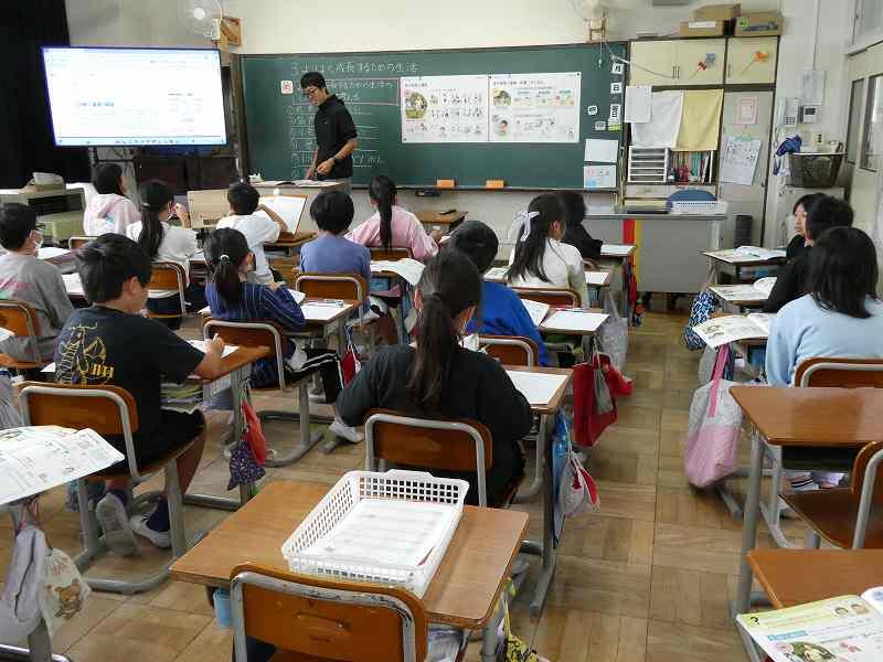 三人の歯科衛生士の方に来ていただき、乳歯の大切さや永久歯は生え替わらないこと、むし歯の原因、歯みがきがむし歯や歯肉炎の予防になることなどを学びました。