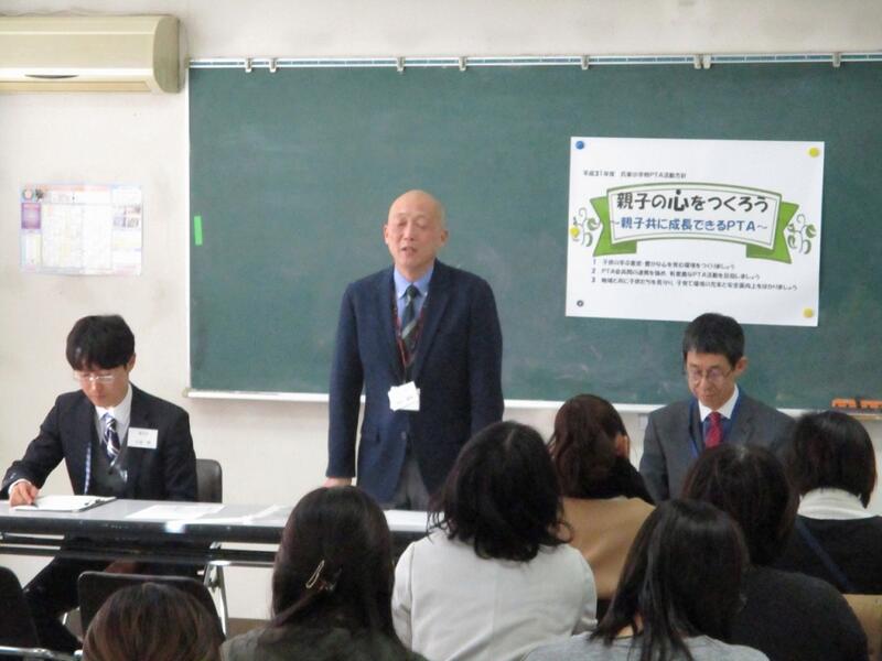 はじめに「学校評価の結果と次年度への改善策」について黒﨑教頭より説明を行いました。(保護者の皆様には、期末PTAにおいて学校評価について説明を行う予定です。)