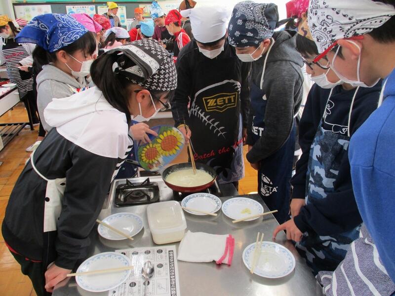 豆腐作りを身近に体験することができ、できあがった湯葉や豆腐を見て驚いている児童もいました。また、自分たちで作った豆腐の味は格別のようでした。