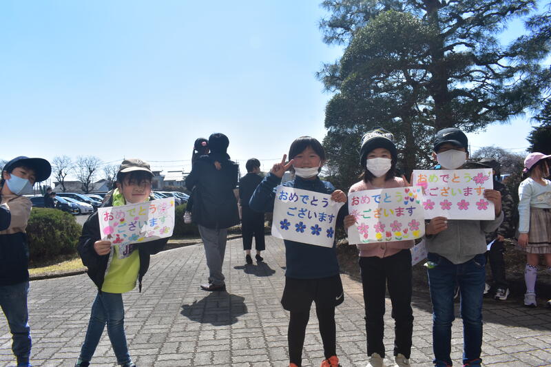 卒業式の後に、1~5年生が見送りをしました。それぞれメッセージを書いた紙や花のアーチを持って、別れを惜しみました。