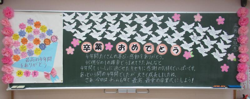 朝の6年教室の黒板です。卒業式を迎える一人一人の思いと担任からのメッセージがありました。