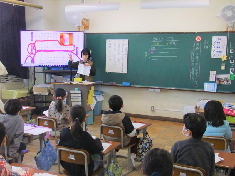 国語の授業です。お気に入りを紹介する文章を書く際に、理由の書き方に気を付けて文章が書けるように学習しています。