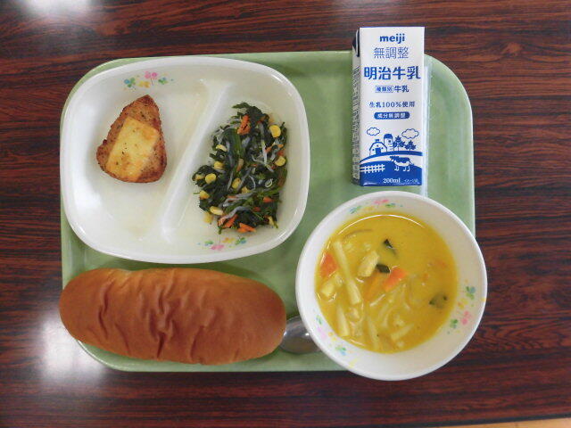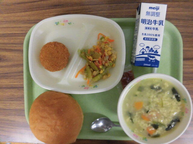 今日は、ポパイサラダにほうれん草がたくさん入っています。ポパイはアメリカのアニメヒーローですが、ほうれん草を食べるとパワー全開になります。ほうれん草には目や肌によいカロテンだけでなく鉄分も多く含まれ、ガン予防の効果もあります。ゆでるとたくさん食べられるため「野菜の王様」とも言われています。しっかり食べて、みんなも元気に過ごしましょう。