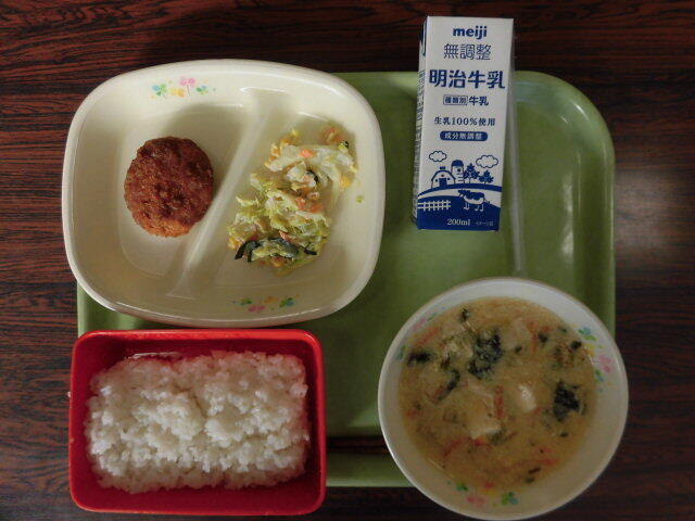 米、春菊、ねぎ、みそは、さくら市で作られたものです。牛乳、ほうれん草、キャベツは栃木県で作られたものです。そして、みそ汁に入っている大根は学校で取れた大根です。