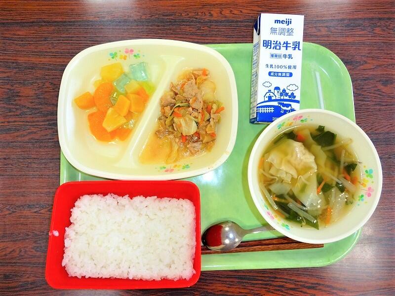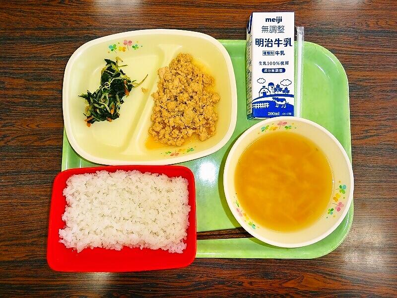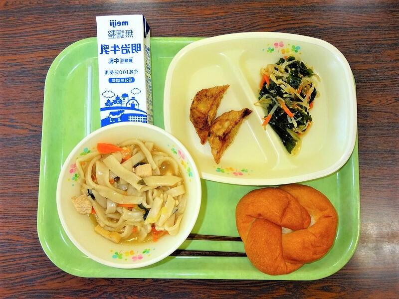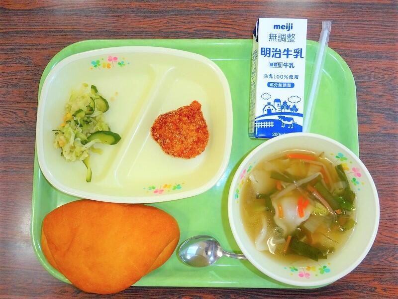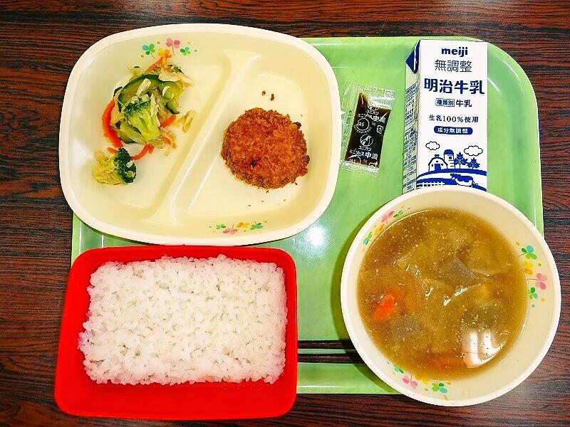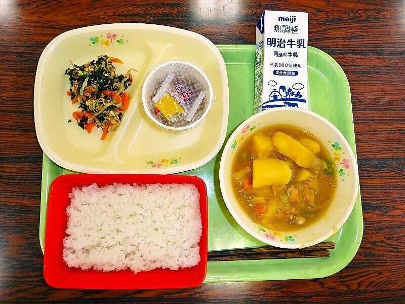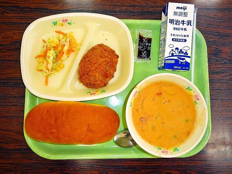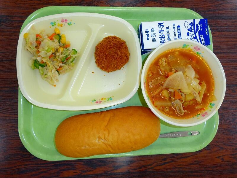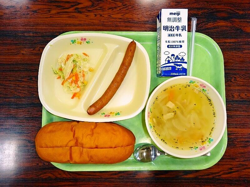 (写真は、1~3年生の献立です。明後日は、1~3年生がコッペパン、4~6年生がココア揚げパンになる予定です)