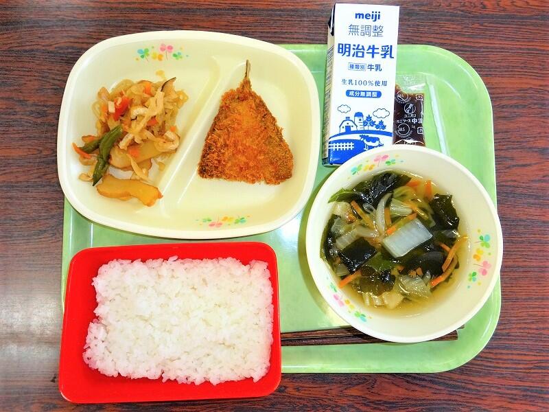 今日の給食には、いかてんぷらのいかや、根菜ごま汁のごぼうや野菜など、かみごたえのある食材をとりいれています。ひと口20回から30回、よくかんで食べましょう。