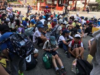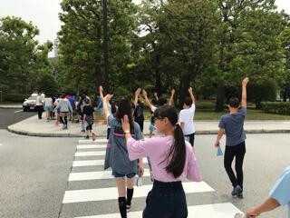 他の学校もかなりたくさん来ています。横断歩道は、いつでも、どこでもしっかりと手を上げて横断していますね。