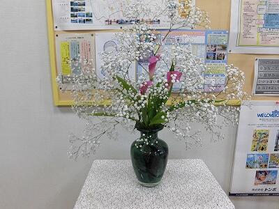 本校には、色んな花瓶がそろっています。素敵なかすみ草とカラーのコラボレーションです。