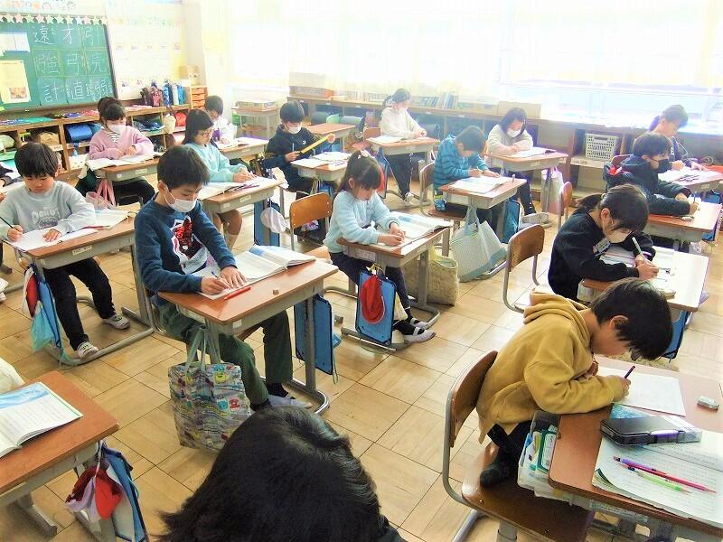 社会の学習の様子です。市の様子と人々のくらしのうつりかわりの学習のまとめのテストをしています。自分たちで調べたことや友達と話し合ったことを思い出しながら、よく考えて答えを書いていました。