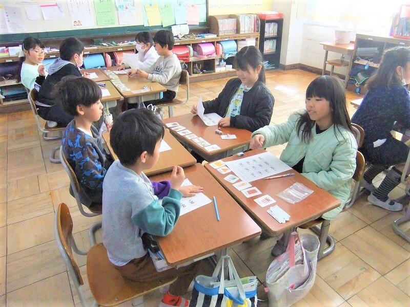国語科の「にているかん字」の学習です。形の似ている漢字の違いに気を付けて書く練習をしたり、似ている漢字を使って文を考えたりする学習をしています。子どもたちは、楽しみながら文を考え、発表することができました。