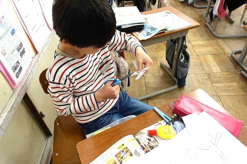 今日は、できあがった作品を台紙に貼ったり、作品づくりで工夫したところ、がんばったところを作品カードに書いたりしていました。子どもたちは、お互いの作品を鑑賞して、表現の工夫を見つけていました。