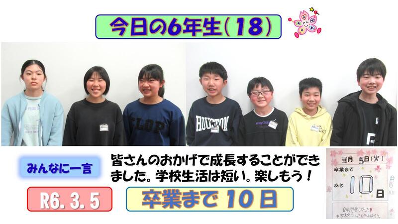 卒業まで、登校する日はあと8日となりました。小学校生活最後の8日間、先生や友達と過ごす時間を大切にしてほしいと思います。いい卒業式にしましょう!