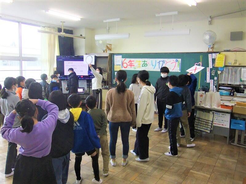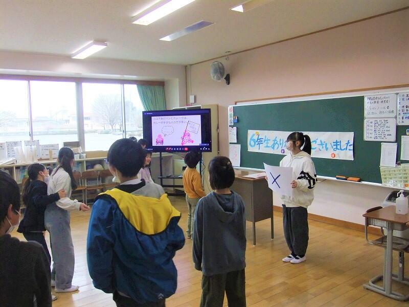 子どもたちは、なかよし班ごとに各教室に分かれ、リモートで出題される氏家小学校に関する〇✕ゲームに挑戦しました。