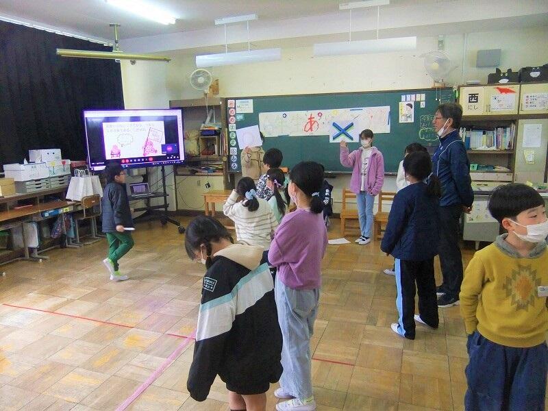 外国語活動の時間です。「みちあんないをしよう」という学習で、目的地への行き方を英語で伝える練習をしました。子どもたちは、ジェスチャーを交えながら楽しんで学習することができました。