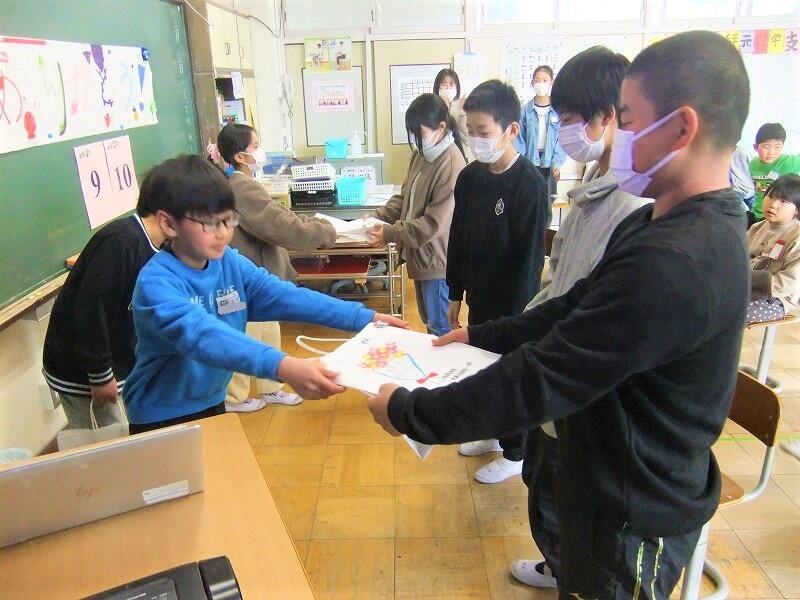その後、なかよし班ごとに、6年生にプレゼントを贈呈しました。プレゼントを手渡す役目は4年生が担当しましたが、袋の中のプレゼントは、各学年の子どもたちが今日まで手分けして準備してきました。