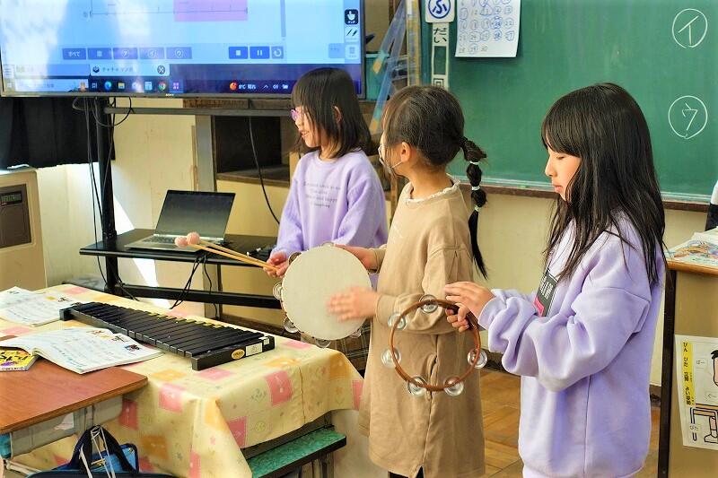 音楽の「音のスケッチ」の活動です。木琴やタンブリンなどの楽器でリズムに合わせて音を出し、一つのメロディーを作ります。子どもたちは、友達と息を合わせて楽しく活動していました。