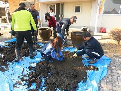 玄関脇に置いてあるハスの植え替え作業を行いました。