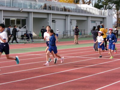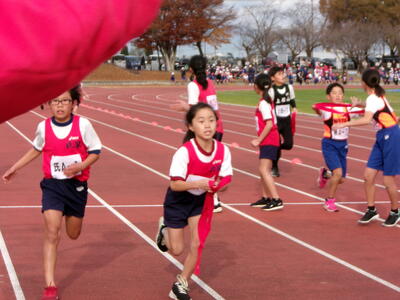 温かい冬晴れの本日、5・6年生の希望者が、駅伝の部とエンジョイランニングの部にそれぞれ参加しました。市内6校の児童が、各校で養った持久走の力を試し、競い合いました。