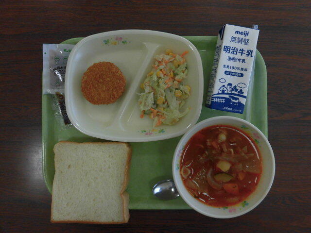 ハヤシライスは、明治時代のはじめに横浜のレストランで作られたのが始まりのようです。大正時代には、全国に広まりました。ハヤシライスの語源は、ハッシュド・ビーフという料理です。これは、うす切りやこま切りの牛肉をバターで炒め、野菜と一緒に煮込こんだ料理です。これをごはんにかければ、ハッシュド・ビーフ・アンド・ライスということになり、それが短くなって「ハヤシライス」となったそうです。給食では、ぶた肉を使いました。