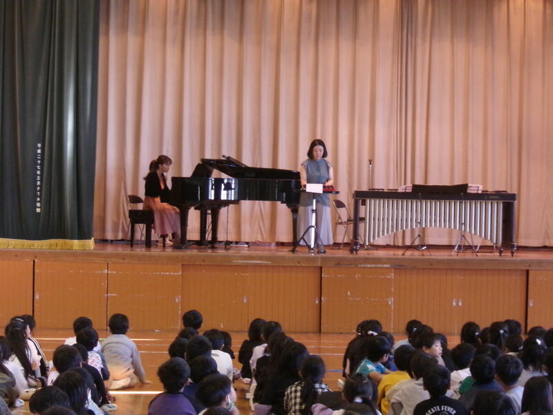 2校時に下学年、3校時に上学年で、音楽鑑賞教室を実施しました。マリンバとピアノのプロの演奏家による素敵な音楽コンサートでした。子どもたちに馴染みのある曲もたくさん演奏され、子どもたちは真剣に聴き入ったり、リズミカルな演奏に合わせて手拍子をしたりと、楽しい時間を過ごしました。