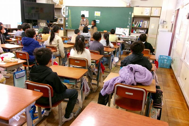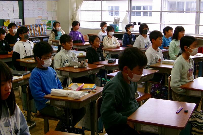代表の児童が大会議室に集まり、各クラスの児童はリモートで参加しました。