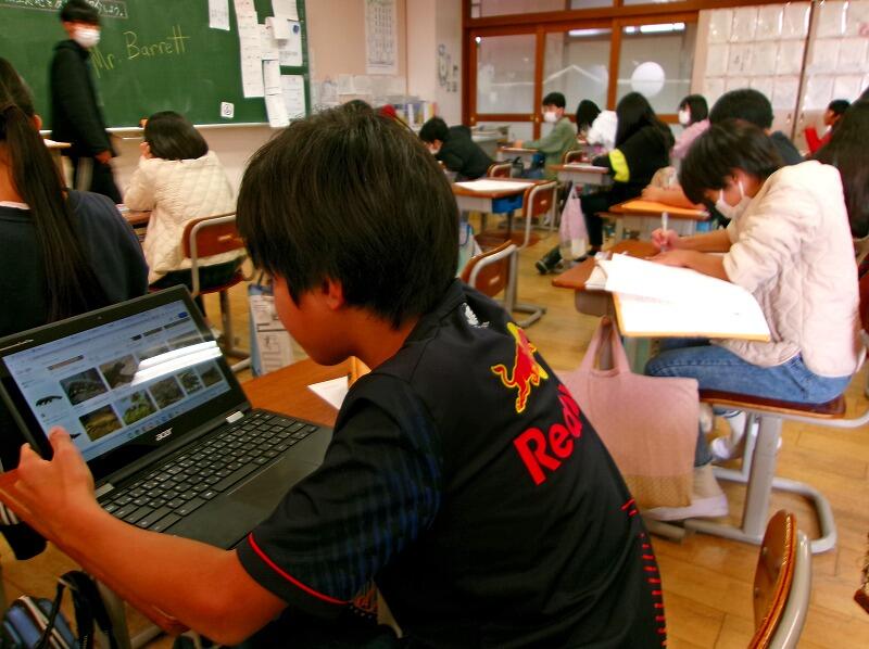 外国語の授業です。絶滅危惧種について調べて、生息地についてカードにまとめています。まとめたものを、グループでお互いに発表し合いました。