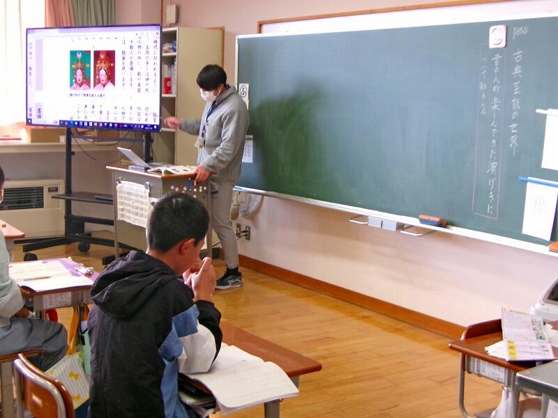国語の「古典芸能の世界」の授業です。狂言、能、歌舞伎、人形浄瑠璃、落語といった古典芸能に触れる活動です。