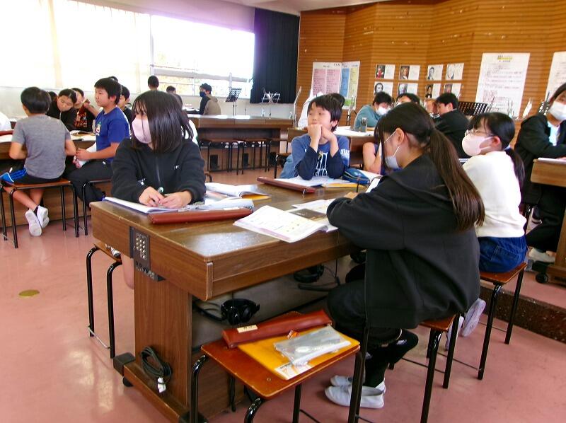 音楽の授業です。鑑賞する活動をしています。曲は「バイオリンとピアノのためのソナタ 第4楽章」です。