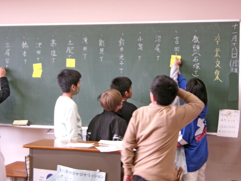 学級活動で、卒業文集の担当について話し合って分担しています。
