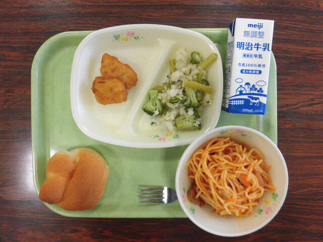 今日の献立は2、3年生に「好きな給食は何ですか?」と聞いた時に、「ナン」と答える人が多かったので「ナン」を使ったメニューにしました。