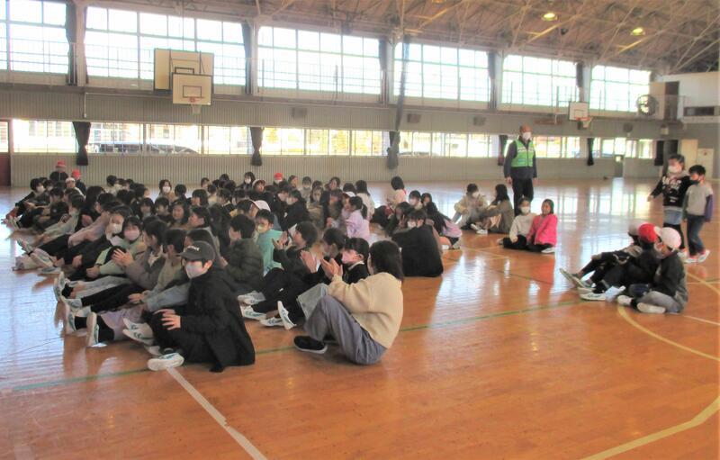 給食の時間に、発表会があることを校内放送で連絡し、希望する児童は自由に見学することができました。