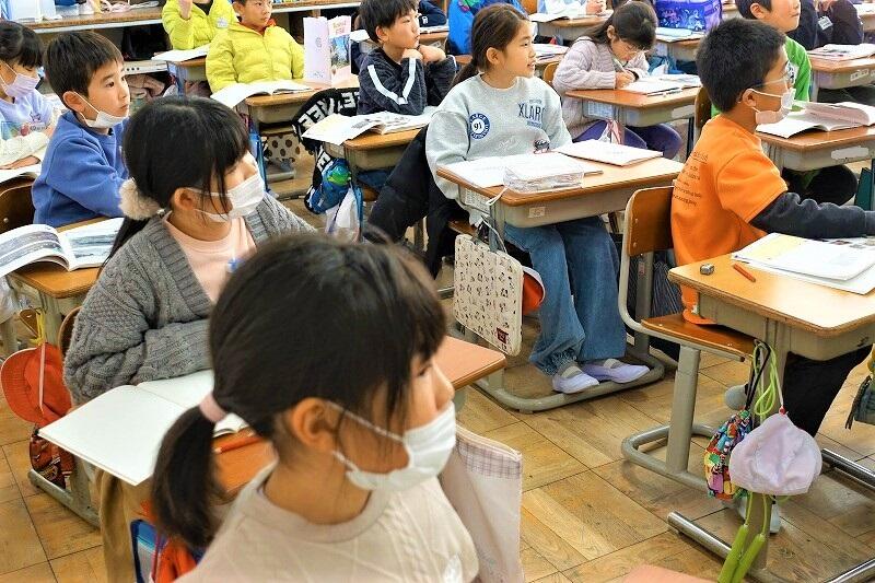給食の時間に、発表会があることを校内放送で連絡し、希望する児童は自由に見学することができました。