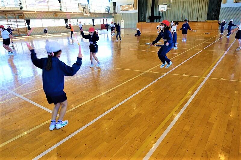 体育の「多様な動きをつくる運動」の一環で、縄跳びをしています。子どもたちは新しい技に取り組んだり、今までやった技を組み合わせたりして、様々なことに挑戦していました。