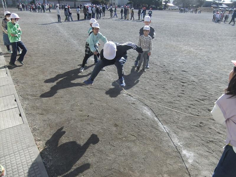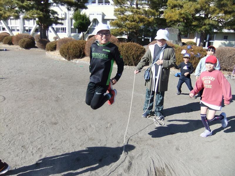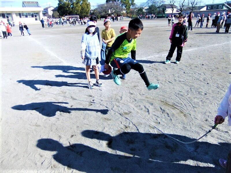 昼休みから練習しているクラスもあり、子どもたちはやる気いっぱいで、跳べた回数を数える元気な声が校庭に響いていました。