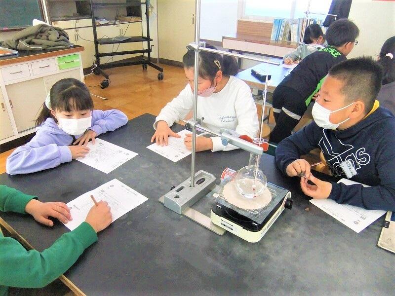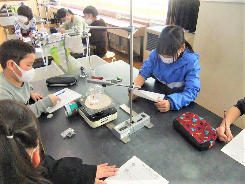 今日は、水を熱したときに何が起きるかを実験しました。フラスコの中の水を、ガスコンロで熱し続けるとどうなるか、水の様子や温度の変化を予想して、その後、実際にやって確かめました。